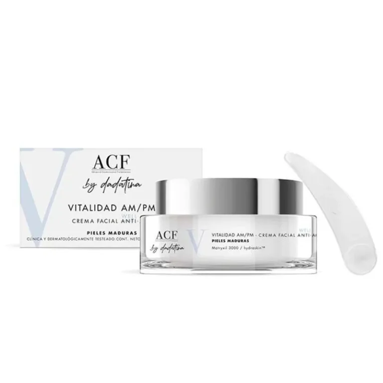 La Crema Facial Vitalidad AM/PM de ACF by Dadatina está especialmente formulada para revitalizar y aportar luminosidad a las pieles