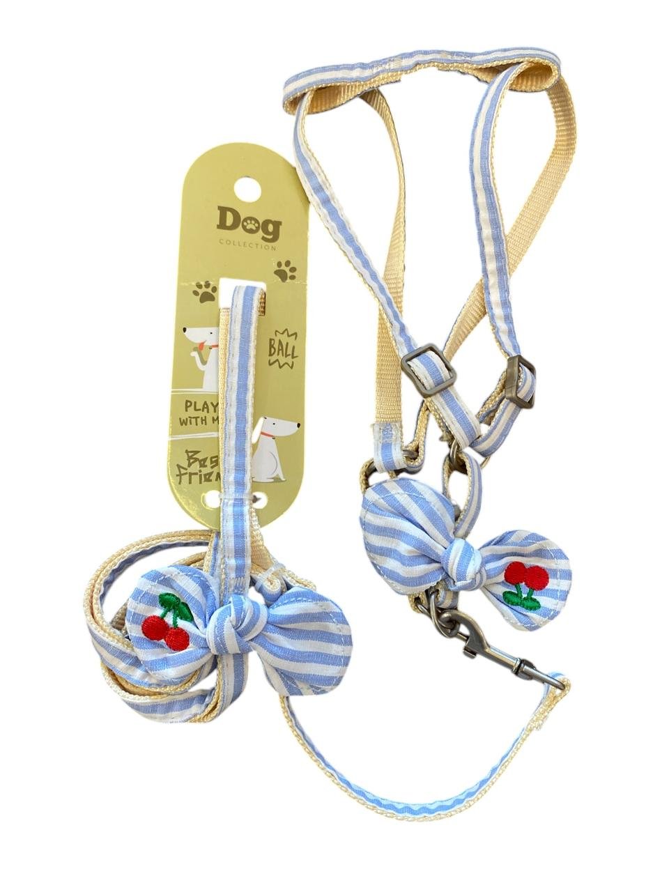 Hermoso conjunto de arnés y correa con diseño a rayas celeste y detalles bordados de cerezas. Ideal para perros pequeños, combina estilo, comodidad y seguridad en cada paseo. Su material suave y ajustable evita roces, mientras que el broche metálico asegura una sujeción firme.