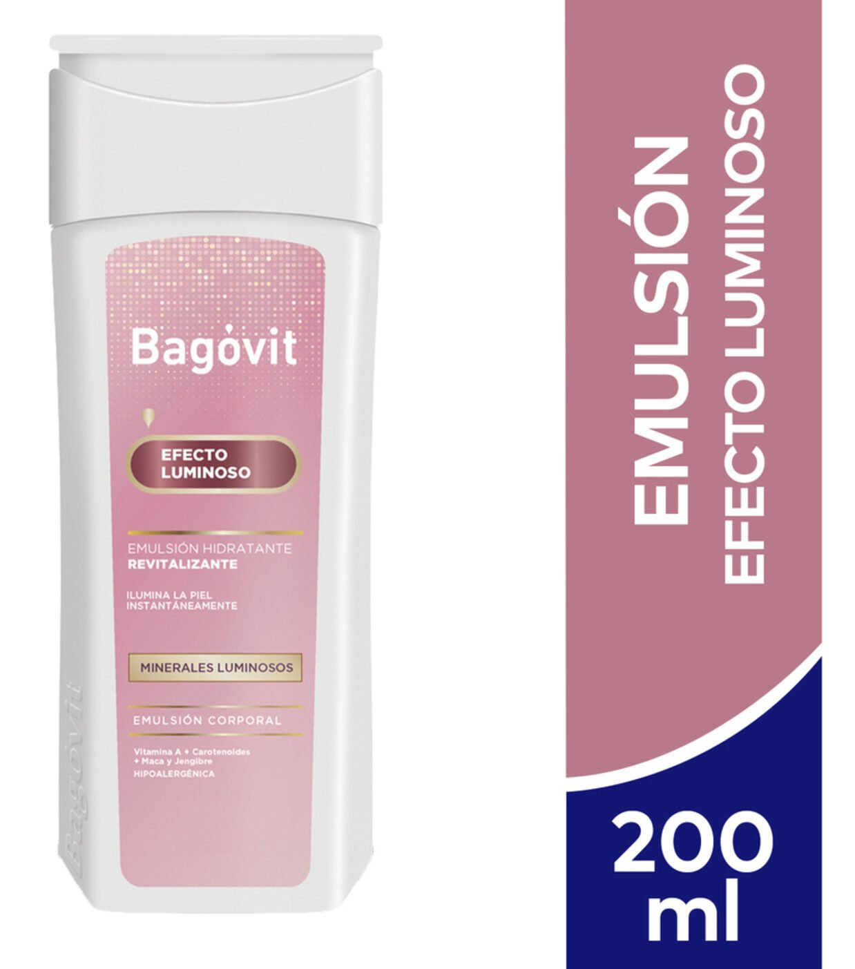 La Emulsión Efecto Luminoso Bagóvit A es una emulsión corporal que ilumina la piel instantáneamente proporcionando sutiles reflejos de luz, mientras brinda hidratación profunda y duradera (24 hs). No deja la piel oleosa. Brinda una sensación posterior suave, única y sedosa. Su exclusiva fórmula ultraliviana combina Pigmentos Minerales Luminosos + Vitamina A + Carotenoides + Maca y Jengibre. Hidrata por 24 hs, revitalizando e iluminando la piel en apenas una aplicación.