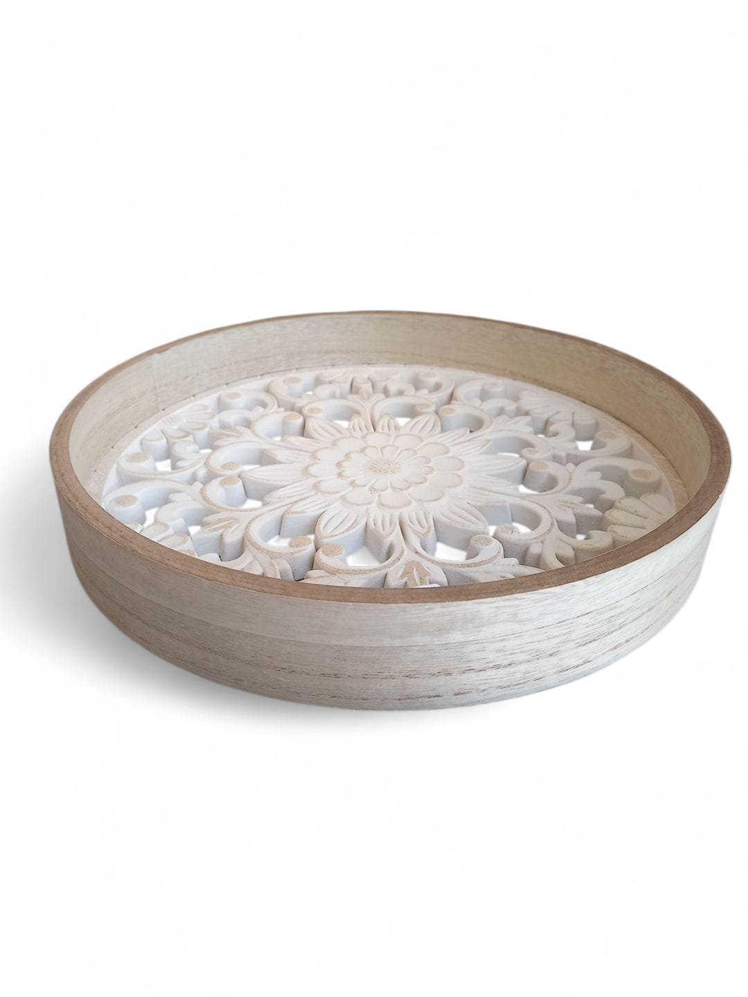 Bandeja decorativa de madera con labrado, 30 cm de diámetro.