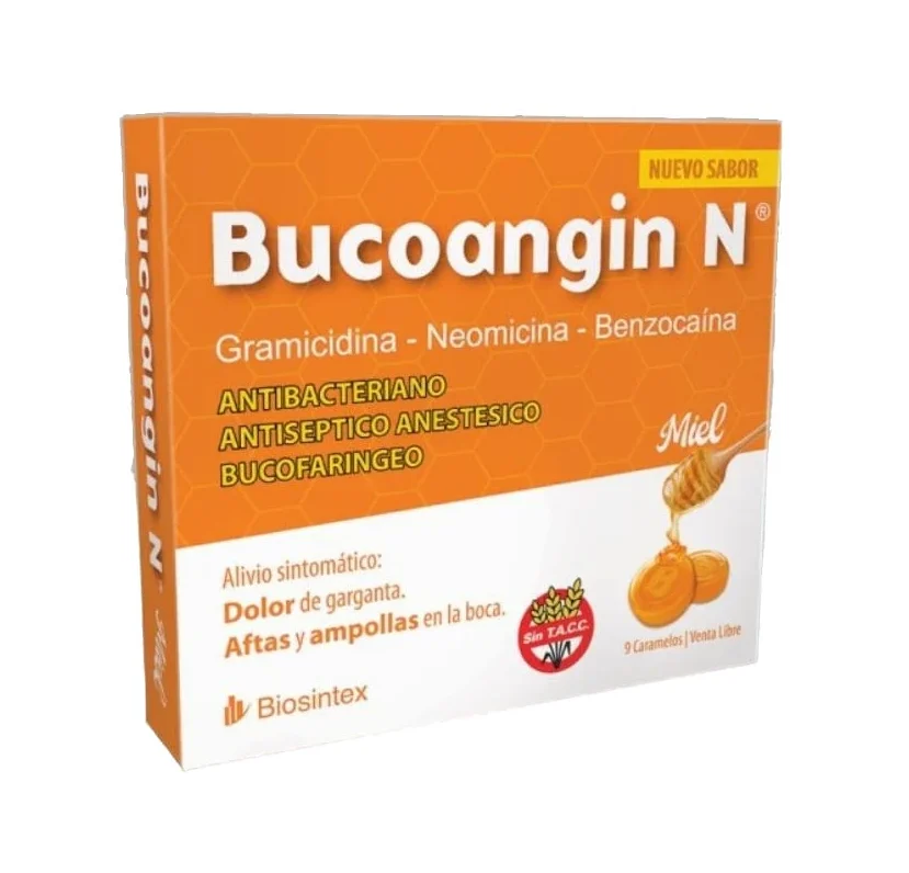 Bucoangin N Caramelos Antibióticos x 9 unidades. Principio Activo Gramicidina 0,25 mg Neomicina 2,5 mg Benzocaína 10 mg. Administración y Dosis Indicado para el alivio del dolor de garganta. Dejar disolver en la boca 1 caramelo cada 3 o 4 horas.