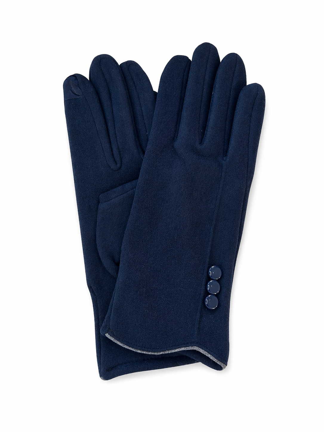 Guantes elegantes en tono azul marino, confeccionados en material suave de excelente calidad que garantiza abrigo y confort. Su diseño minimalista se destaca por líneas limpias y un delicado detalle aplicado en el dorso que aporta distinción. Incorporan puntera táctil para uso de dispositivos móviles sin necesidad de retirarlos. Un accesorio sofisticado y versátil, ideal para complementar looks urbanos o formales en temporada invernal.