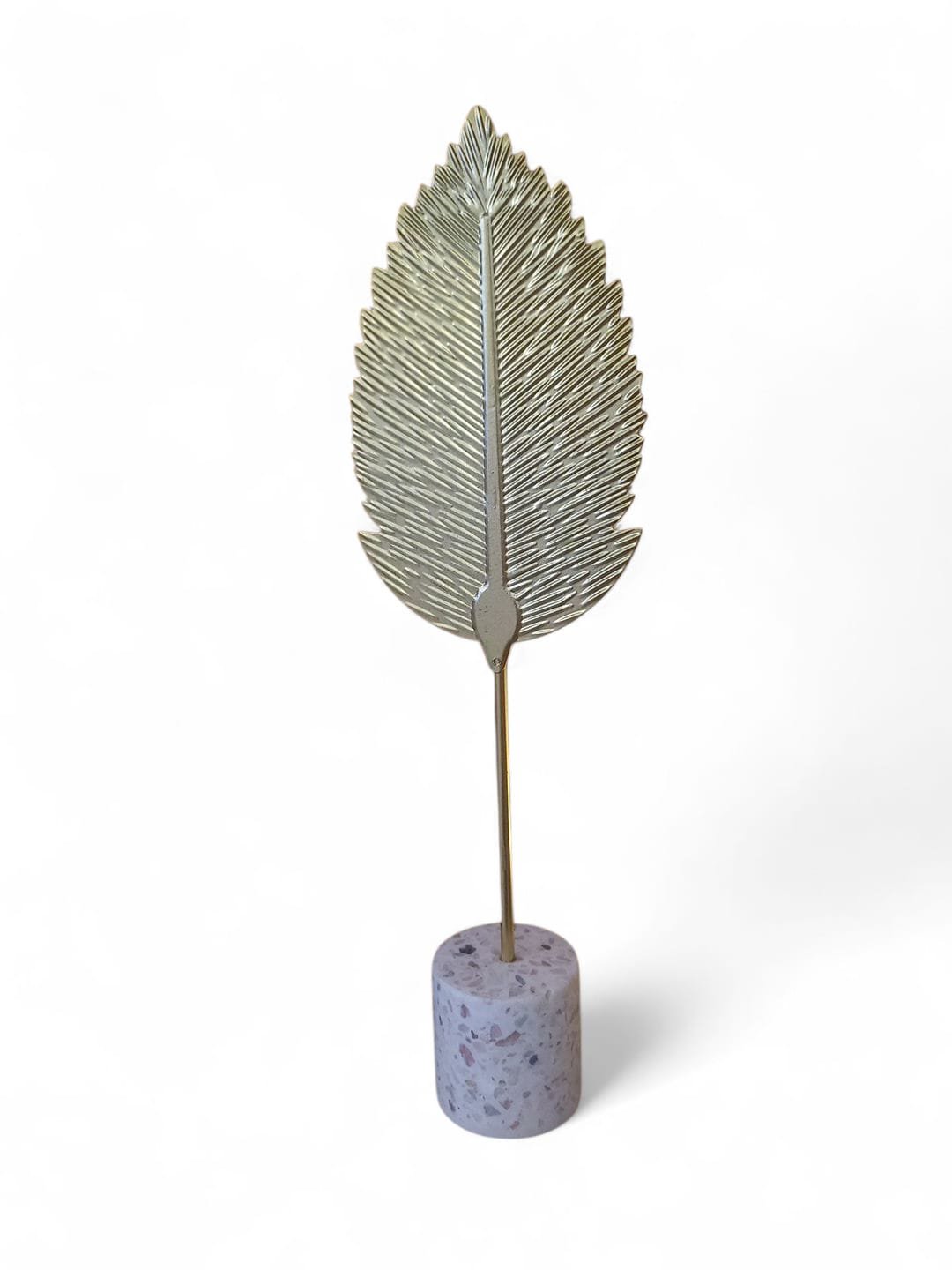 Hoja dorada de metal con base de cemento blanco. Altura 25,5 cm.