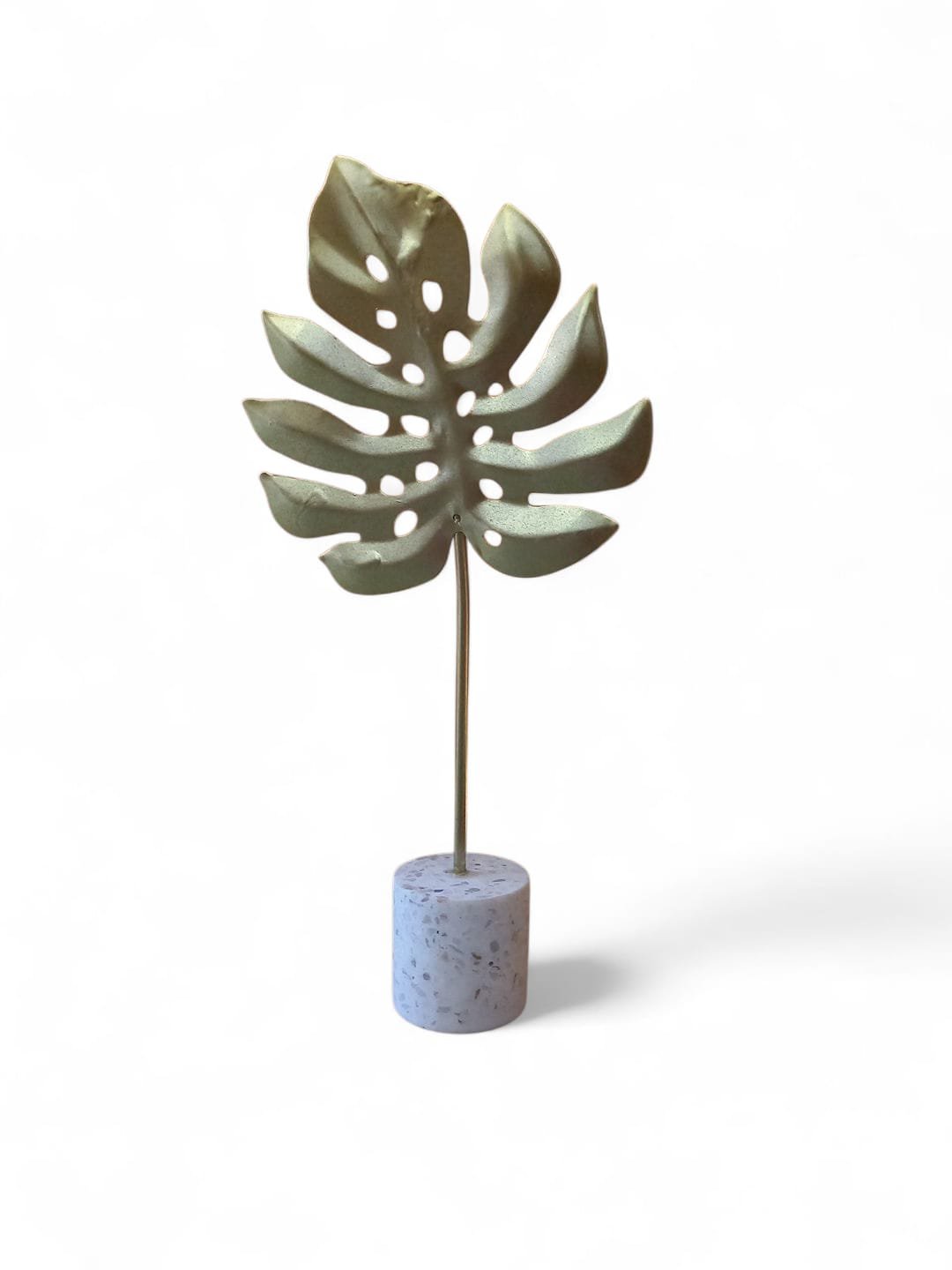 Hoja de Metal dorada con base de cemento blanco. Ideal para decorar tus espacios.