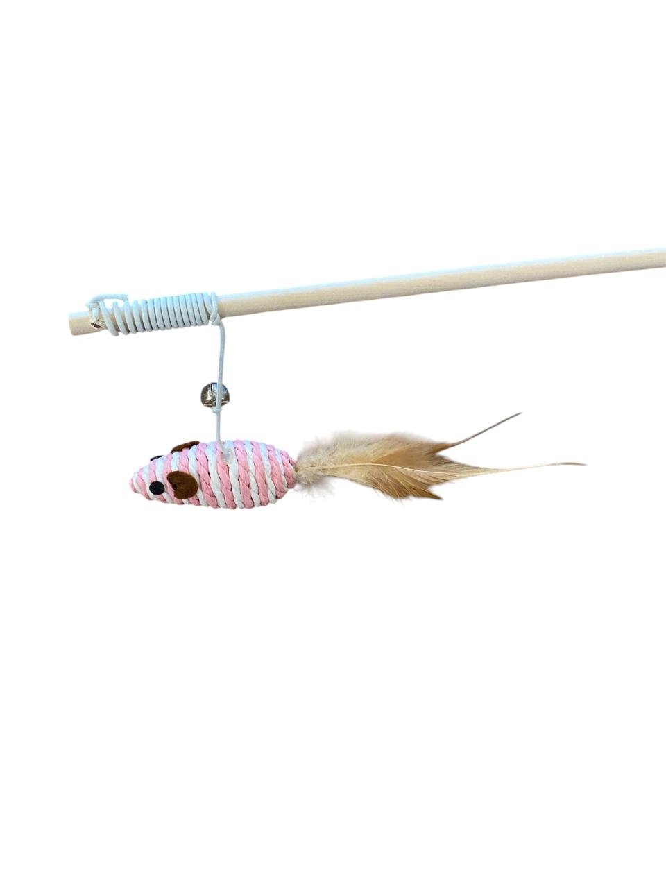 Divertido juguete interactivo para gatos, con varita de madera y ratón colgante envuelto en una soga . Incluye plumas naturales y un pequeño cascabel que estimula el instinto de caza de tu gato. Ideal para mantenerlo activo, entretenido y saludable.