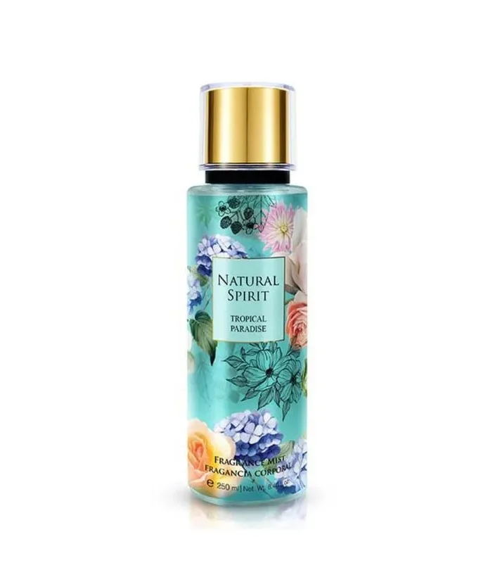 Sumérgete en un oasis de frescura con el Body Splash Tropical Paradise de Natural Spirit. Su familia olfativa tropical te transportará a un paraíso de sensaciones, donde cada aplicación es una invitación a disfrutar de la naturaleza. Floral frutal acuoso. Salida: pera, mandarina, naranja. Corazón: sandía, sal marina, flor de tiaré, manzana, rosa, frutilla.Fondo: ámbar, almendra caramelizada, musk.