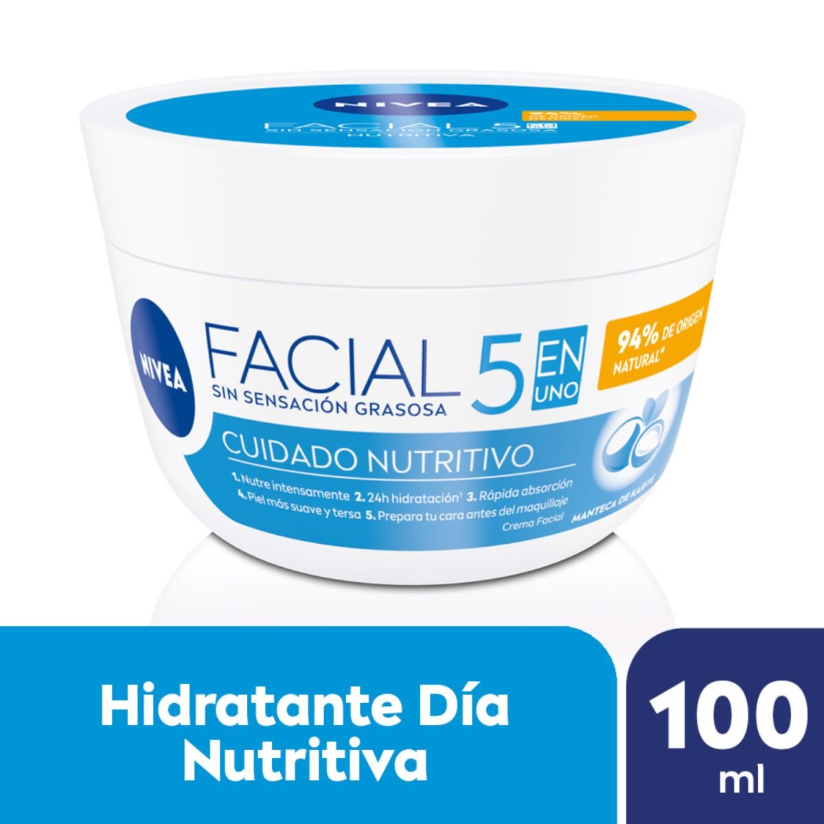 La Crema facial 7 en 1 NIVEA Cuidado Nutritivo nutre intensamente la piel sin dejar sensación grasosa. Después de dos semanas de uso regular, brinda 24 horas de hidratación profunda y duradera. Su fórmula contiene hidronutrientes que se absorben inmediatamente en la piel, dejándola suave y radiante. Está libre de parabenos, alcohol y el 94% de sus ingredientes son de origen natural. Es adecuada para todo tipo de pieles.