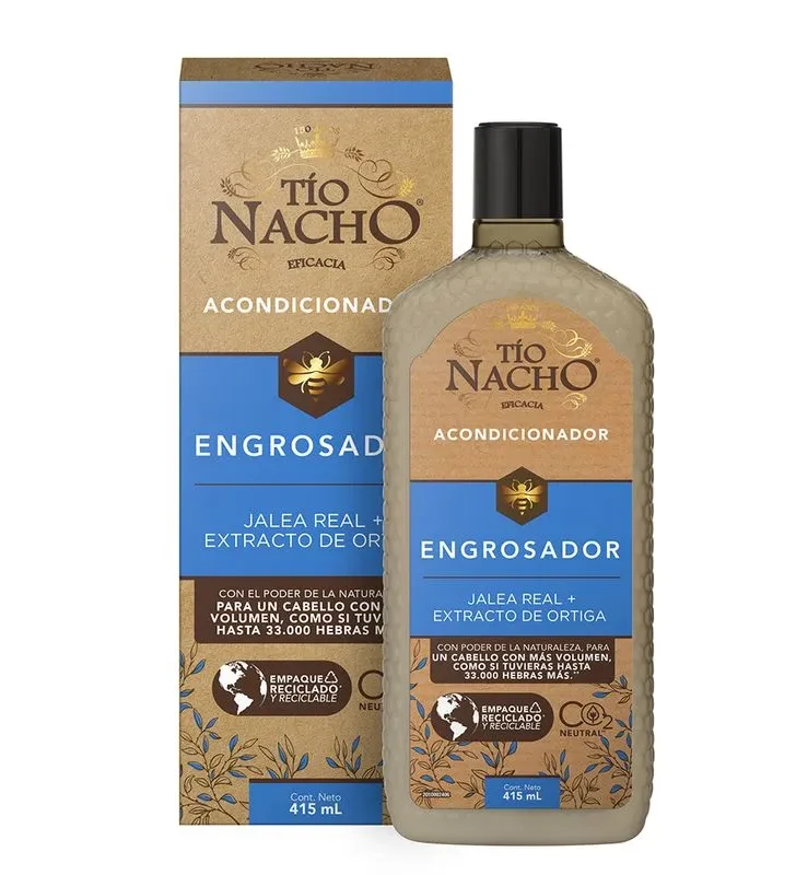 Acondicionador Tío Nacho Engrosador, con una combinación de Jalea Real y Capilgross para pelo con más volumen, fuerte y grueso. Aumenta el diámetro de cada pelo dejándolo más fuerte y más grueso. Con mayor volumen gracias a su fórmula con el componente exclusivo Capilgross.
